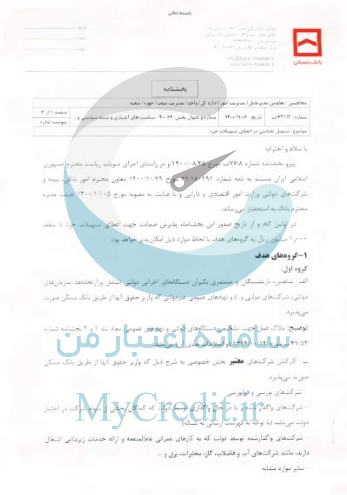 پیرو بخشنامه شماره /76/8ب مورخ 1400/08/25 و در راستای اجرای منویات ریاست محترم جمهوری اسلامی ایران مستند به نامه شماره 62/180492 مورخ 1400/10/29 معاون محترم امور بانکی، بیمه و شرکت های دولتی وزارت امور اقتصادی و دارایی و با عنایت به مصوبه مورخ 1400/11/05 هیئت کدیره محترم بانک به استحضار میرساند: