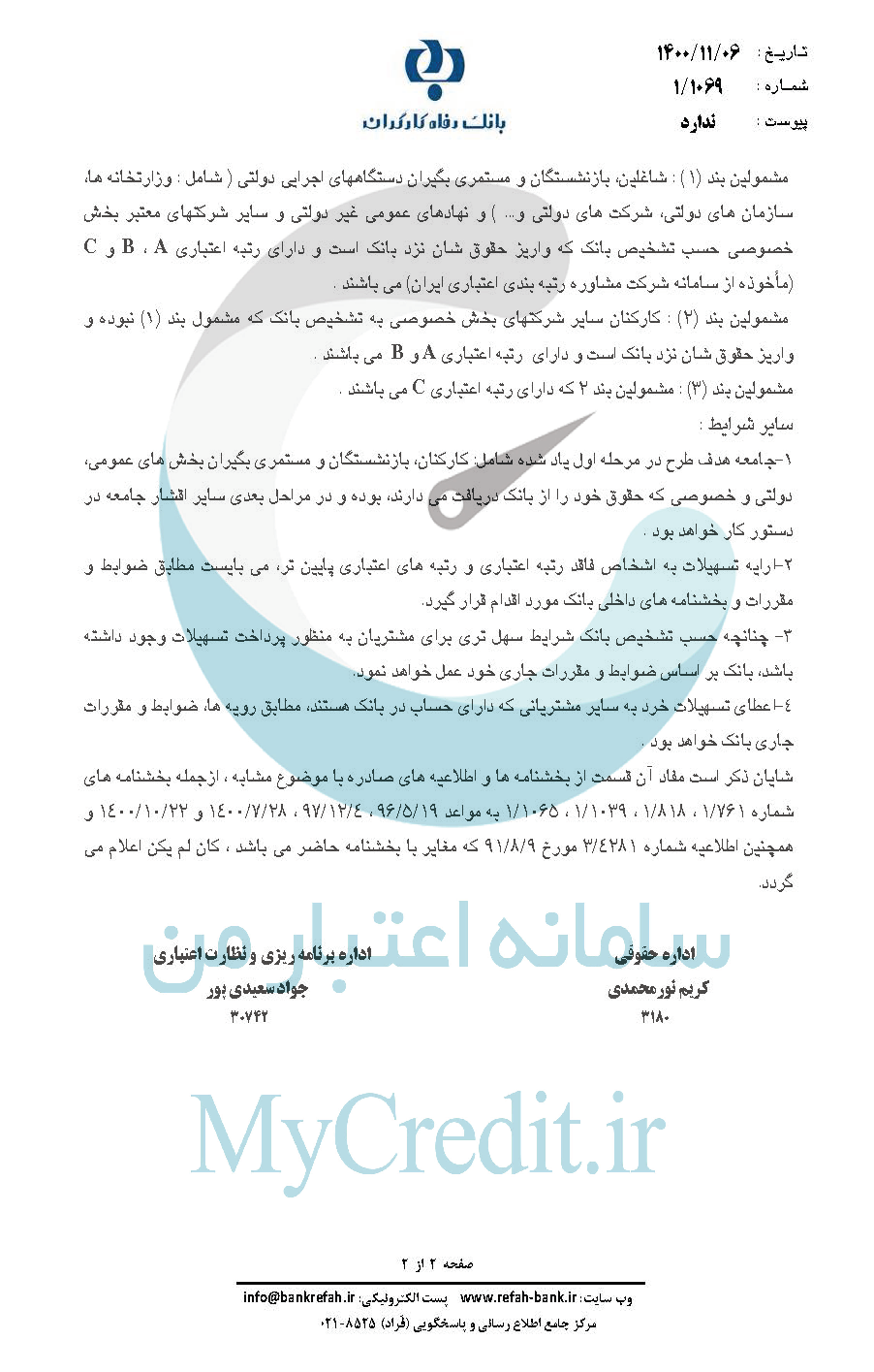 2 ارايه تسهيلات به اشخاص فاقد رتبه اعتباری و رتبه های اعتباری پايين تر، می بايست مطابق ضوابط و - مقررات و بخشنامه های داخلی بانک مورد اقدام قرار گيرد.