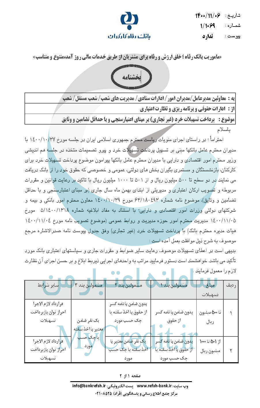 احتراماً ؛ در راستای اجرای منويات رياست محترم جمهوری اسلامی ايران در جلسه مورخ 27 / 10 / 1400 با مديران محترم عامل بانکها مبنی بر تسهيل پرداخت تسهيلات خرد و پيرو تصميمات متخذه در جلسه هم انديشی وزير محترم امور اقتصادی و دارايی با مديران محترم عامل بانکها پيرامون موضوع پرداخت تسهيلات خرد برای کارکنان، بازنشستگان و مستمری بگيران بخش های دولتی، عمومی و خصوصی که حقوق خود را از بانک دريافت می نمايند در دو سطح تا 500 ميليون ريال و از 501 تا 1000 ميليون ريال با تاکيد بر رعايت قوانين و مقررات مربوطه و تصويب ارکان اعتباری و مديريتی از ابتدای بهمن ماه سال جاری (بر مبنای اعتبارسنجی و با حداقل تضامين و وثايق)، موضوع نامه شماره 180492 / 62 مورخ 29 / 10 / 1400 معاون محترم امور بانکی و بيمه و شرکتهای دولتی وزرات امور اقتصادی و دارايی؛ با استناد به مفاد ابلاغيه شماره 1218 / 1400 / 5 مورخ 05 / 11 / 1400 مديريت محترم امور حوزه مديريت و روابط عمومی (موضوع تصويب نامه مورخ 04 / 11 / 1400 هيات مديره محترم بانک) با پرداخت تسهيلات خرد (غير تجاری) وفق جدول پيوست نامه صدرالاشاره مرجع موصوف به شرح ذيل موافقت بعمل آمده است : بديهی است در اعطای تسهيلات موصوف رعايت ساير ضوابط و مقررات جاری و سياستهای اعتباری بانک مورد تأکيد می باشد. خواهشمند است دستور فرماييد مراتب به واحدهای اجرايی ذيربط ابلاغ و بر حسن اجرای آن نظارت لازم را معمول فرمايند.