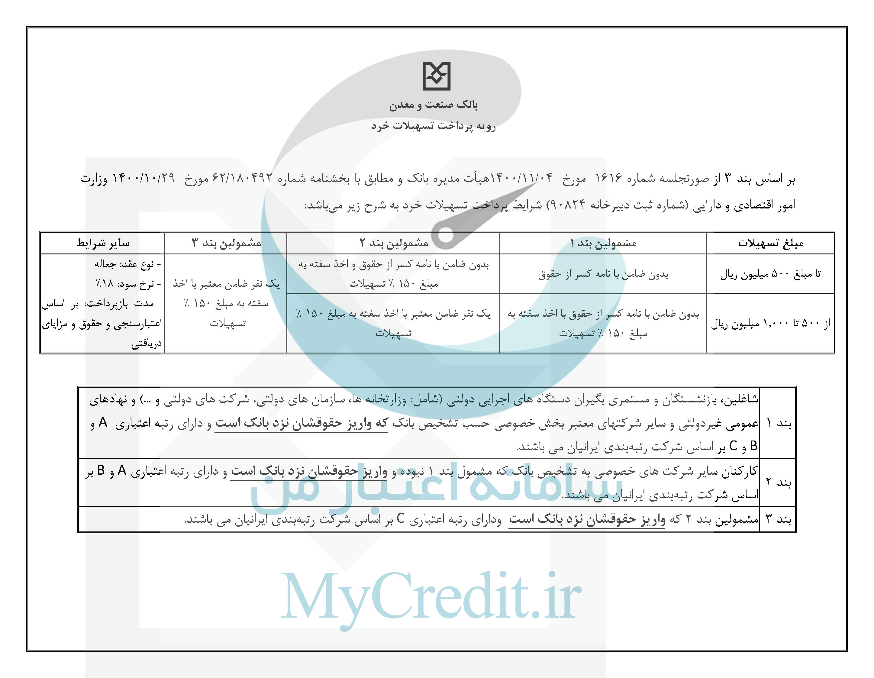 بر اساس بند 3 از صورتجلسه شماره 1616 مورخ 04/11/1400هیأت مدیره بانک و مطابق با بخشنامه شماره 180492/62 مورخ 29/10/1400 وزارت امور اقتصادی و دارایی) شماره ثبت دبیرخانه 90824 )شرایط پرداخت تسهیلات خرد به شرح زیر میباشد: