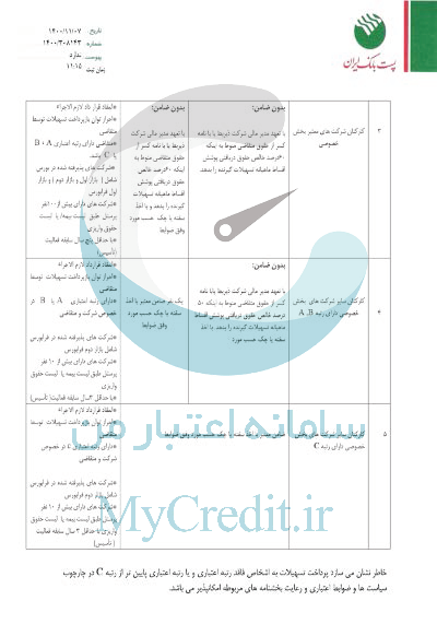 خاطر نشان می سازد پرداخت تسهیلات به اشخاص فاقد رتبه اعتباری و یا رتبه اعتباری پایین تر از رتبه C درچارچوب سیاست ها و ضوابط اعتباری و رعایت بخشنامه های مربوط امکانپذیر می باشد.